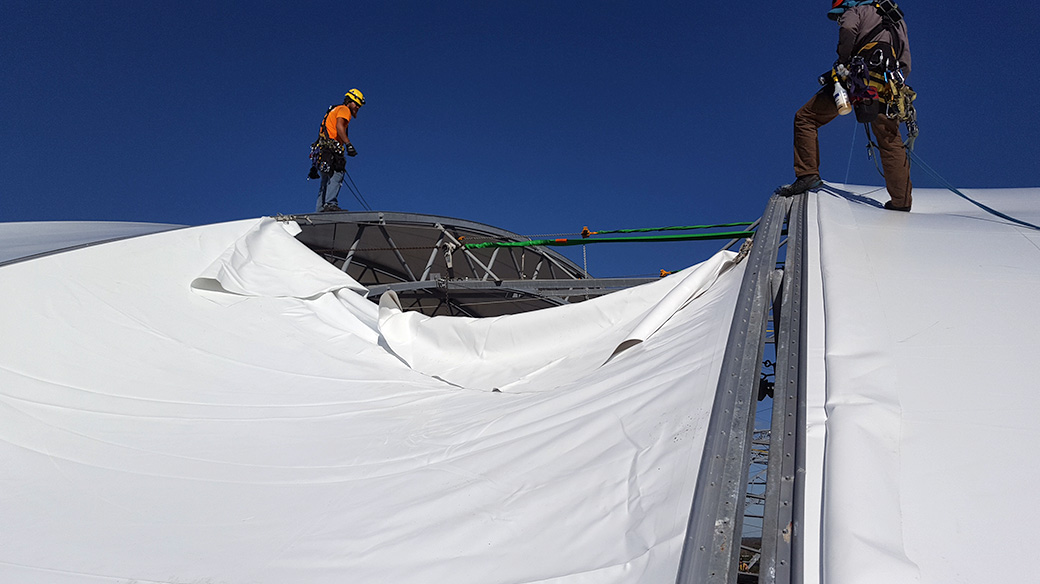 The proper installation of PTFE, PVC or ETFE membrane structures requires much care, planning and know-how by a qualified design-build specialty contractor for fabric structures. While a project’s engineering and manufacturing phases are taking place, Span Flex project managers and engineers meet with the general contractor to review the construction methodology and coordinate erection procedures and scheduling. The equipment typically used during the installation phase includes cranes, construction forklifts, booms, lulls, and scissor lifts.